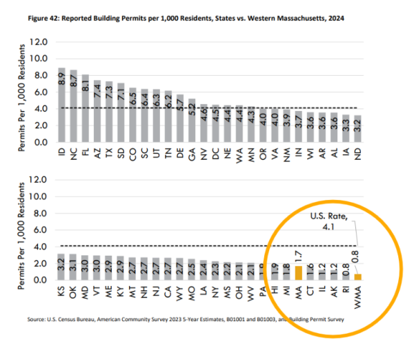 One headline data point the study calls out is how far behind western Massachusetts lags in terms of housing production, as measured by the number of building permits issued per 1,000 residents. Our four counties issue just 0.8 permits per 1,000 residents—compared to 1.7 statewide and 4.1 nationwide.